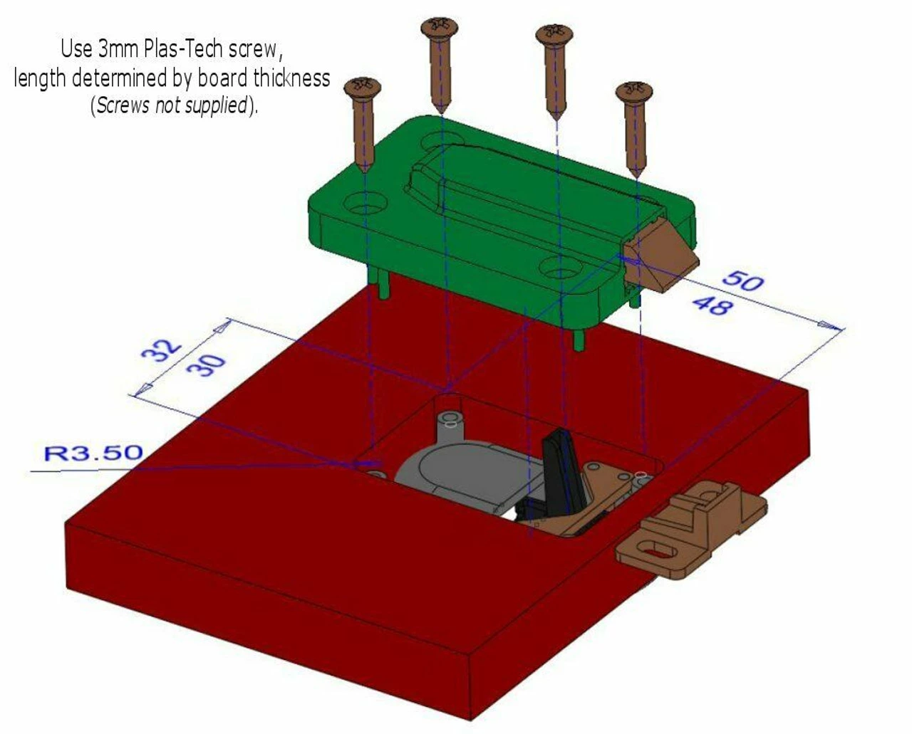 - Requires 3mm plas-tech screw. Fixing screws not included