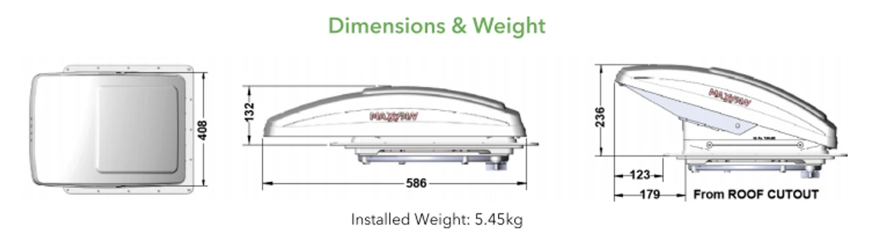 The MaxxFan features a powerful, fuse protected, sealed ball bearing 12 volt fan motor with 12″ 10 bladed fan for quiet operation in your Campervan, Caravan or Motorhome.