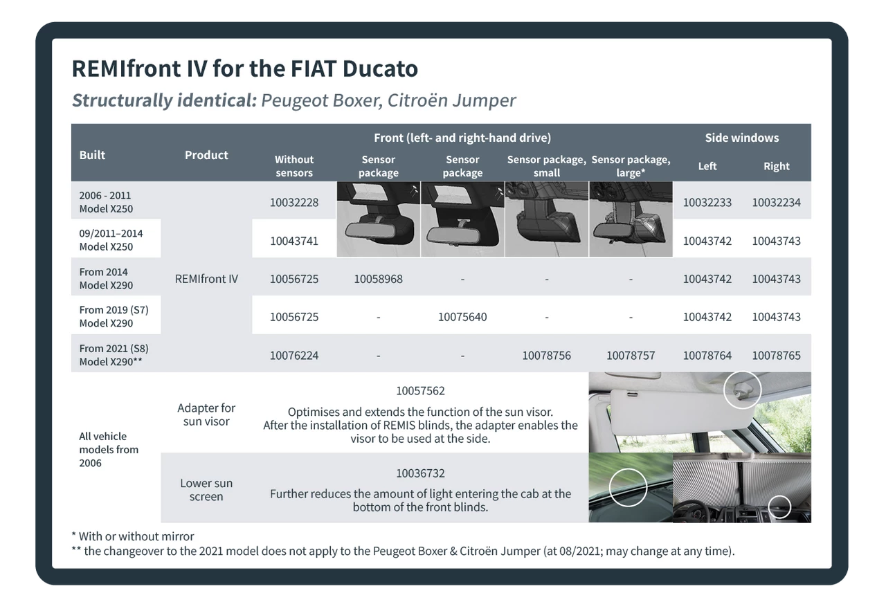 The Remis Remifront cab blinds are designed especially for the Fiat Ducato, Peugeot Boxer, Citroen Relay, and Citroen Jumper motorhomes and campervans,